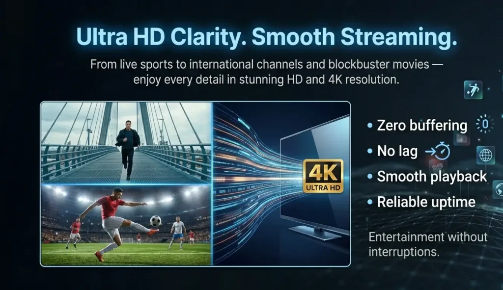Experience next-level IPTV with ultra-smooth streaming, crystal-clear resolution, and uninterrupted access — anytime, anywhere.